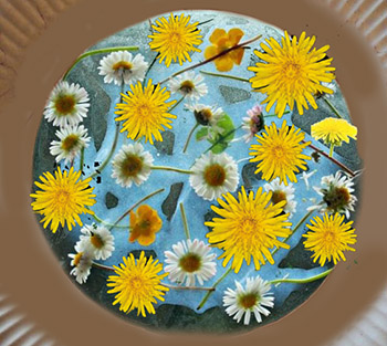 Was Sie benötigen: Blumen ohne Stiele, Pappteller, durchsichtige Klebefolie, Schere.