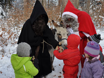 Beim Einkehrbrauch wird der heilige Nikolaus meist vom Knecht Ruprecht begleitet. Dieser hat ein geschwärztes Gesicht, zerrissene und schmutzige Kleidung am Leib und hat Rute sowie Sack dabei. Nikolaus, das ist der frühere Bischof aus Myrna, zu erkennen an Krummstab und Mitra, der kommt am 6. Dezember und belohnt die braven Kinder, in manchen Gegenden Deutschlands mit seinem Helfer, dem Krampus oder Knecht Ruprecht.