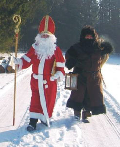 Ein Bischof mit Namen Nikolaus beschenkte vor vielen hundert Jahren arme Kinder mit Äpfeln und Nüssen. Später wurde er heilig gesprochen, und in Erinnerung an den wohltätigen Mann kommt noch heute der Sankt Nikolaus am 6. Dezember, seinem Namenstag, zu den Kindern. Der Knecht Ruprecht (Deutschland), Schmutzli (Schweiz), Krampus (Österreich) oder Zwarte Piet (Niederlanden), ist der Gehilfe des heiligen Nikolaus und oft hat eine Rute in der Hand und einem Sack voller Geschenke, aber auch Kartoffeln oder Kohlenstückchen für die unartigen Kinder. In Frankreich heißt er Pere Fouttard.