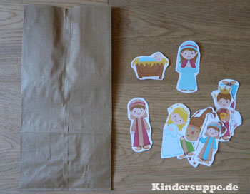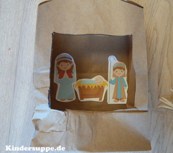 Kleben Sie Maria, Josef und das Jesuskind in der Krippe und der kleine Junge mit seinen Schafen an die Rückseite des Beutels.
